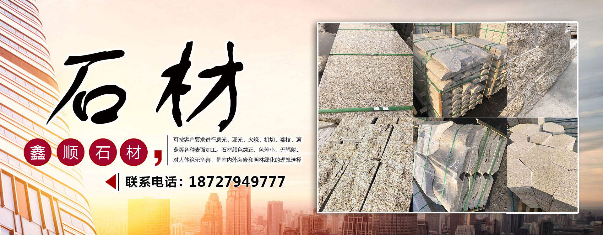 隨州市鑫順石材有限公司位于湖北省隨州市隨縣萬和鎮(zhèn)桐柏山。是一家集礦山開采、石材加工、異形制作、產(chǎn)品銷售為一體的大型綜合型石材企業(yè)!本公司主要經(jīng)營:中花白麻,小花白麻,黃金麻,黃金鉆,芝麻灰,鐘山青,芝麻黑,泌陽紅,各類異形石材。生產(chǎn)的石材規(guī)格齊全、做工精細,被廣泛用于外墻干掛、廣場地鋪、市政園林、建筑工程、環(huán)境景觀異形石材等各類建筑墻體、地面的裝飾裝修。公司專注于石材行業(yè)多年,生產(chǎn)優(yōu)質(zhì)的無色差優(yōu)質(zhì)白麻,永不吐銹量大,穩(wěn)定,主攻高鐵站,地鐵站,機場等大型市政房產(chǎn)。可承接各種異形加工,速度快,質(zhì)量無憂。我們秉承“誠信經(jīng)營,服務(wù)為本”的經(jīng)營理念,竭誠為廣大客戶提供優(yōu)質(zhì)的產(chǎn)品和滿意服務(wù),期待與您的合作,竭誠歡迎國內(nèi)外新老客戶前來訂購洽談!